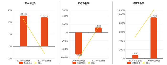 公司营业总收入为455.24亿元。归母净利润为1.01亿元,较去年同报告期归母净利润增加5.47亿元。经营活动现金净流入为21.43亿元,较去年同报告期经营活动现金净流入增加19.63亿元,实现2年连续上涨,同比较去年同期上涨1089.81%。