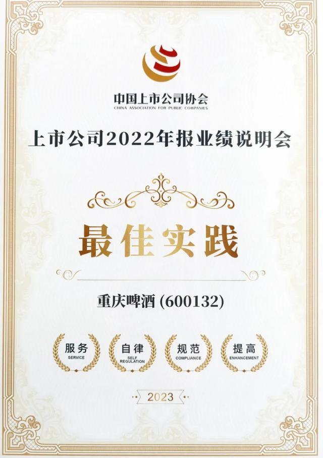 近日,在2023中国上市公司发展论坛上,重庆啤酒荣获中国上市公司协会颁发的“上市公司2022年报业绩说明会最佳实践”奖项。这是继2020年首次入选该奖后,重庆啤酒再次获得权威认可。