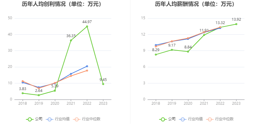 截至2023年末,公司员工总数为14588人,人均创收192.66万元,人均创利9.45万元,人均薪酬13.92万元,较上年同期分别变化-17.29%、-78.98%、4.52%。