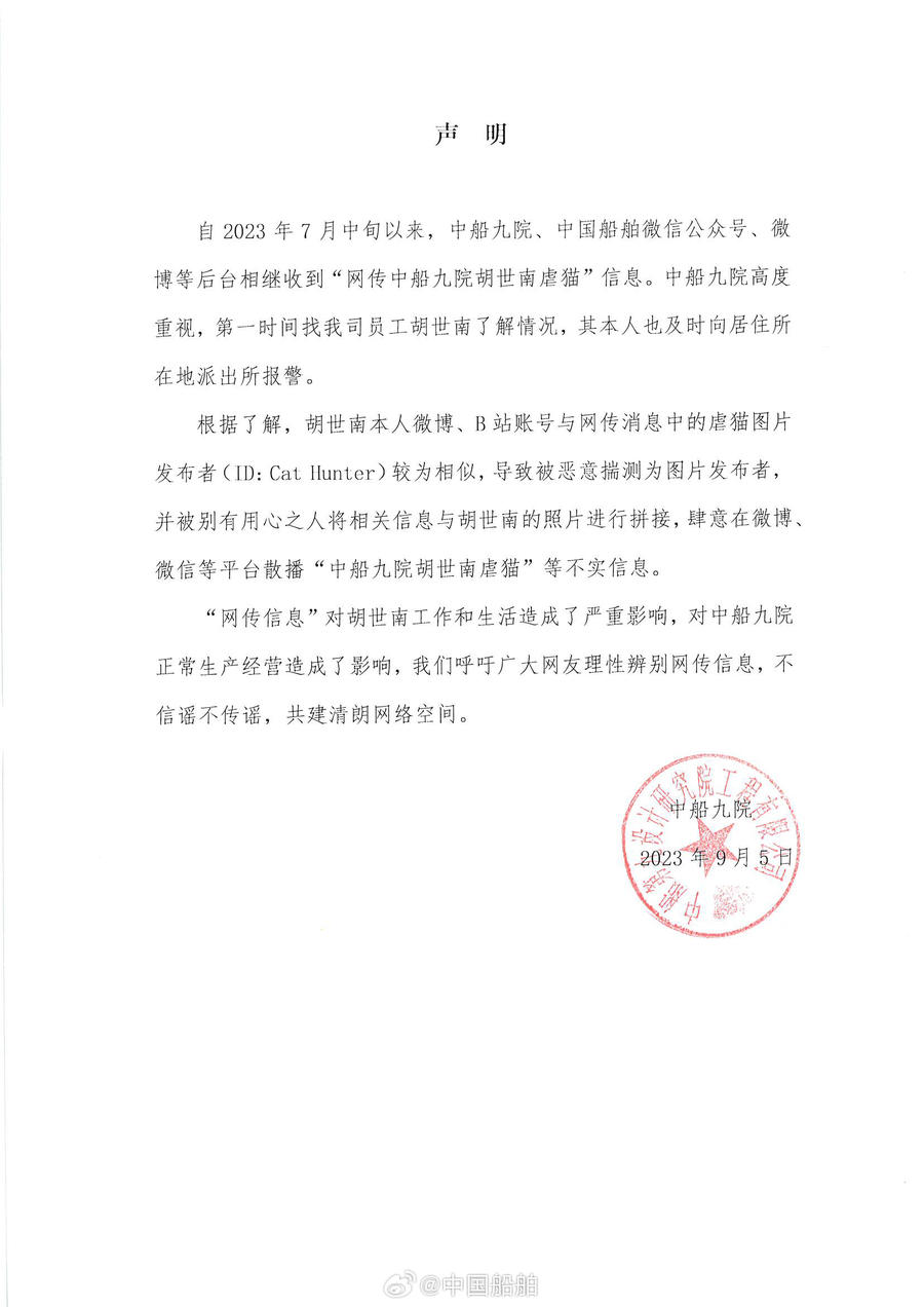 中国船舶:网传“中船九院胡世南虐猫”系不实信息