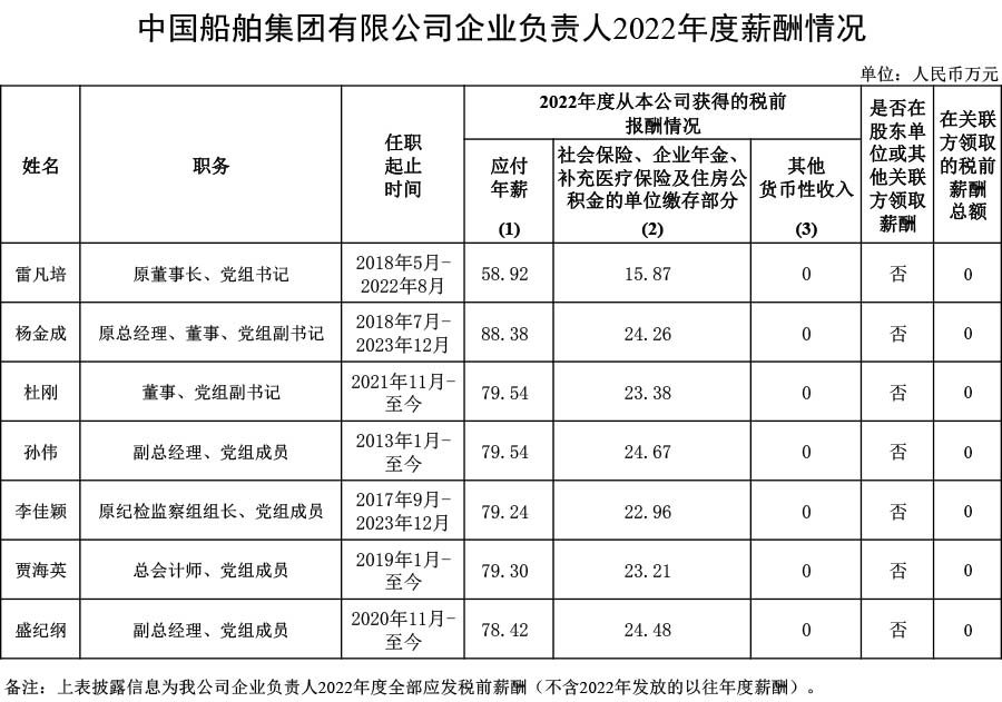 中国船舶集团披露企业负责人2022年度薪酬情况