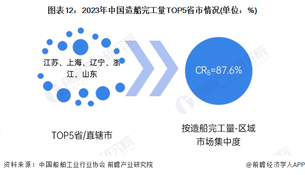 从造船完工量来看,根据船舶工业行业协会披露的信息,2023年,我国造船完工量Top5省市,依次为江苏省、上海市、辽宁省、浙江省和山东省,Top5省市造船完工量占全国份额的87.6%。