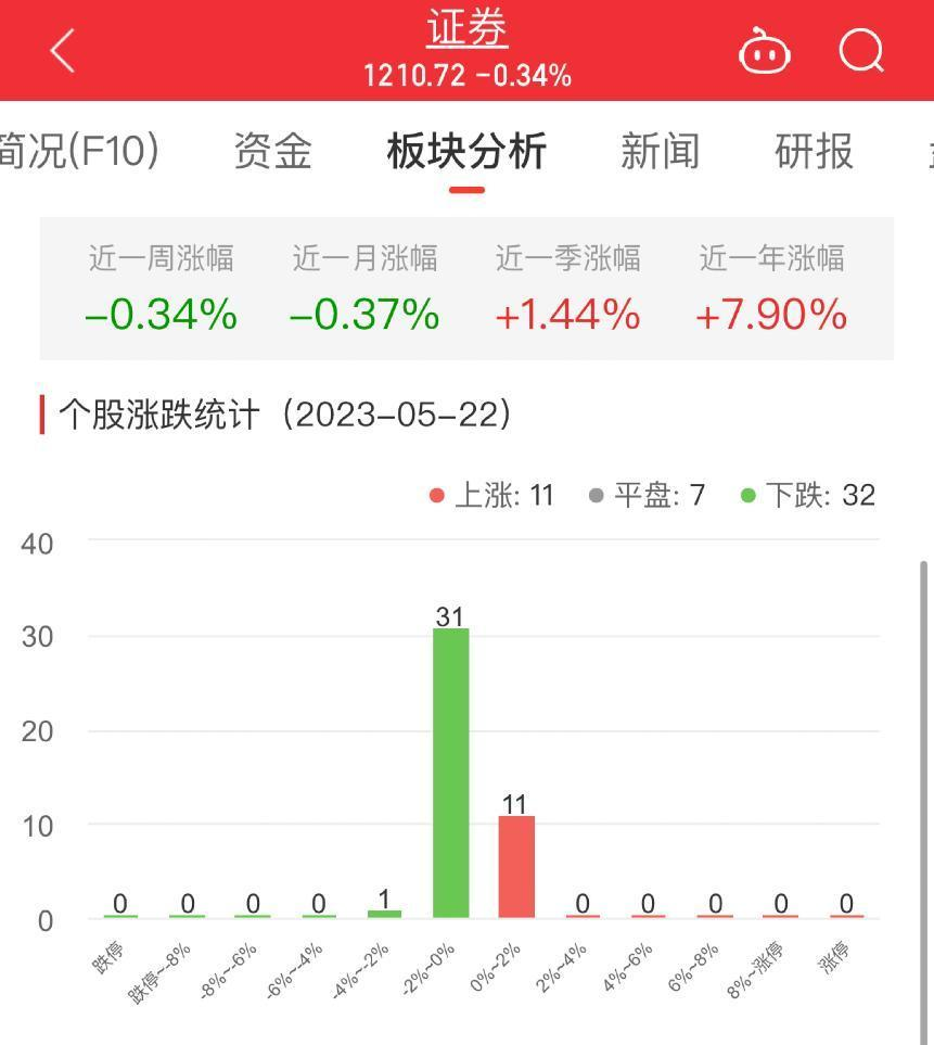 中国经济网北京5月22日讯 今日,证券板块整体跌幅0.34%,其中11只股票上涨,7只股票平盘,32只股票下跌。