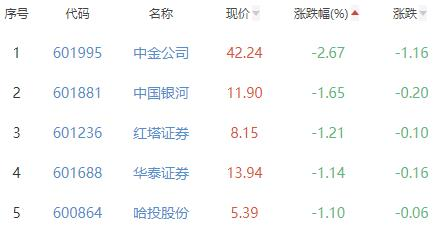 中金公司、中国银河、红塔证券、华泰证券、哈投股份位列涨幅榜后五位,涨幅分别为-2.67%、-1.65%、-1.21%、-1.14%、-1.10%。