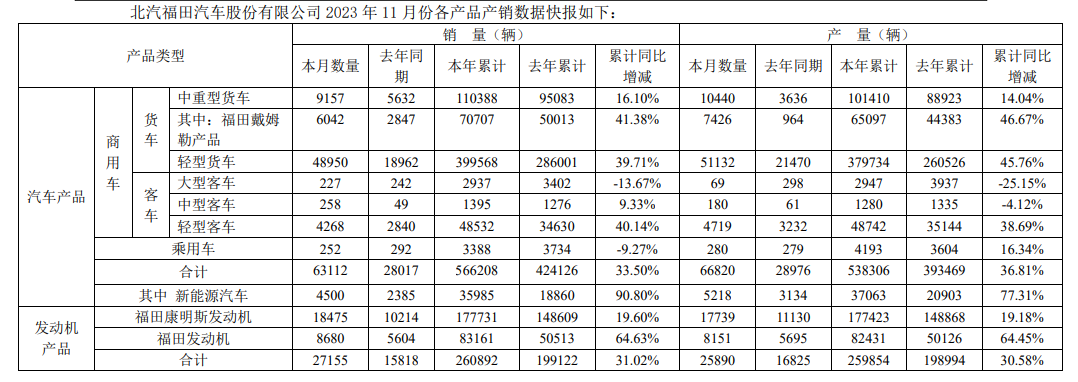 福田汽车:前11月汽车销量56.62万辆,同比增长33.5%
