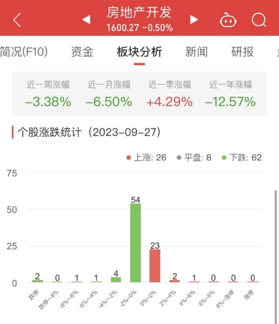 中国经济网北京9月27日讯今日,房地产开发板块整体涨幅-0.50%,其中26只股票上涨,8只股票平盘,62只股票下跌。