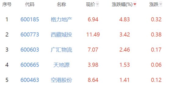 其中,格力地产、西藏城投、广汇物流、天地源、空港股份位列板块涨幅榜前五位,涨幅分别为4.83%、3.42%、2.46%、1.53%、1.41%。
