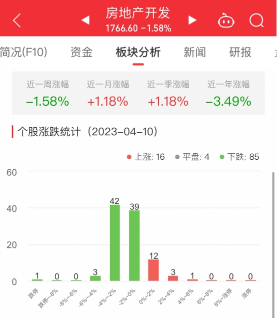 中国经济网北京4月10日讯今日,房地产开发板块整体涨幅-1.58%,其中16只股票上涨,4只股票平盘,85只股票下跌。