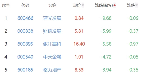 蓝光发展、财信发展、张江高科、中天金融、格力地产位列板块涨幅榜后五位,涨幅分别为-9.68%、-5.99%、-5.58%、-4.72%和-3.94%。