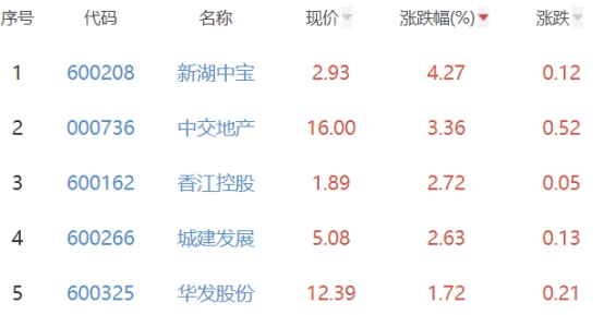 其中,新湖中宝、中交地产、香江控股、城建发展、华发股份位列板块涨幅榜前五位,涨幅分别为4.27%、3.36%、2.72%、2.63%和1.72%。