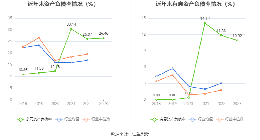 在偿债能力方面,公司2023年年末资产负债率为26.46%,相比上年末上升0.39个百分点;有息资产负债率为10.92%,相比上年末下降0.96个百分点。