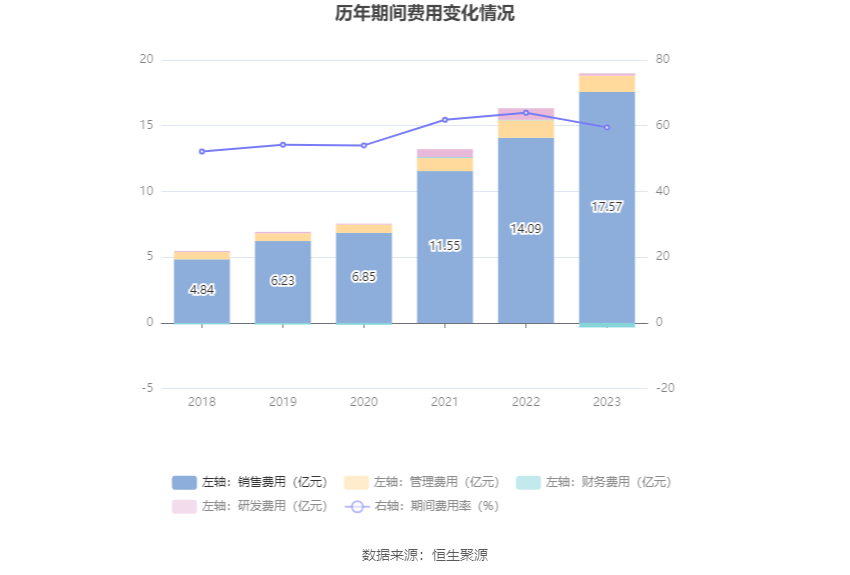 2023年,公司期间费用为18.65亿元,较上年同期增加2.31亿元;但期间费用率为59.50%,较上年同期下降4.46个百分点。其中,销售费用同比增长24.73%,管理费用同比下降6.39%,研发费用同比下降80.31%,财务费用由去年同期的429.12万元变为-3371.19万元。
