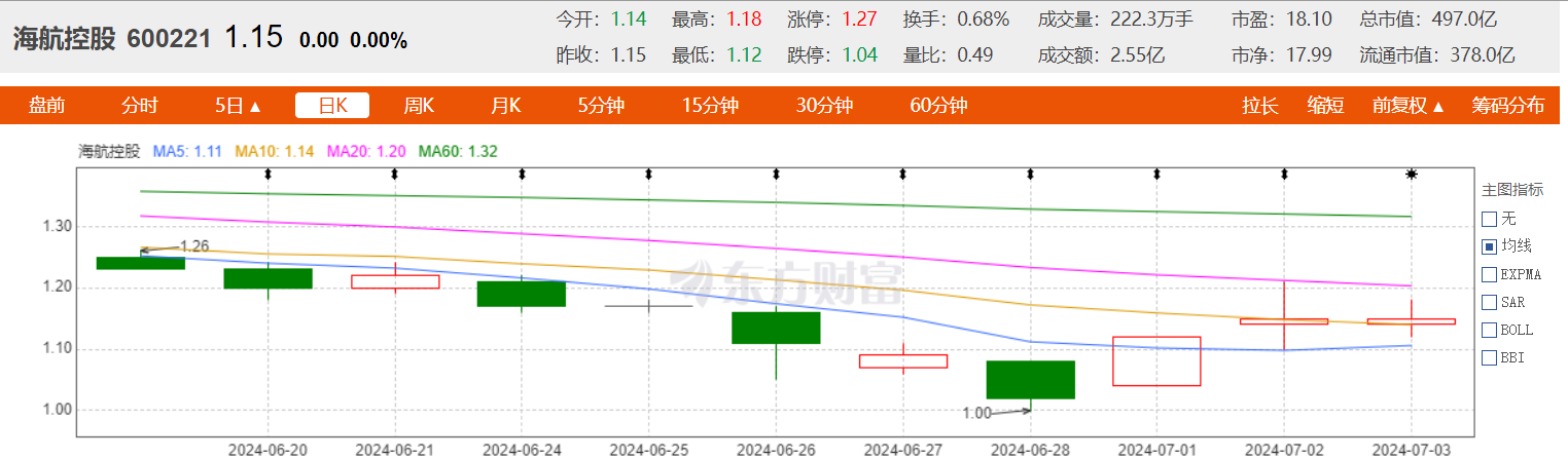 7月1日(本周一)开盘不到一个半小时,海航控股盘中触及涨停板。当天股价报收于1.12元,较前一个交易日上涨9.80%。7月2日和7月3日股价继续上扬,最高时超过1.20元/股,与股价骤跌前6月24日的股价水平大致接近。