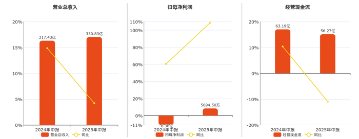 公司营业总收入为330.83亿元,在已披露的同业公司中排名第4,较去年同报告期营业总收入增加13.41亿元,实现3年连续上涨,同比较去年同期上涨4.22%。归母净利润为5694.50万元,较去年同报告期归母净利润增加6.93亿元,实现3年连续上涨。经营活动现金净流入为56.27亿元,在已披露的同业公司中排名第4。