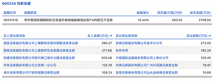 12月18日,科新发展今日涨停,全天换手率达1.4%,振幅达0%。龙虎榜数据显示,营业部席位合计净买入418.89万元。其中,机构合计净卖出162.24万元。此外,国金证券上海静安区南京西路证券营业部、西南证券上海普陀区宜君路证券营业部分别买入395.27万元、277.68万元;浙商证券金华分公司、中国国际金融上海分公司分别卖出273.00万元、103.45万元。