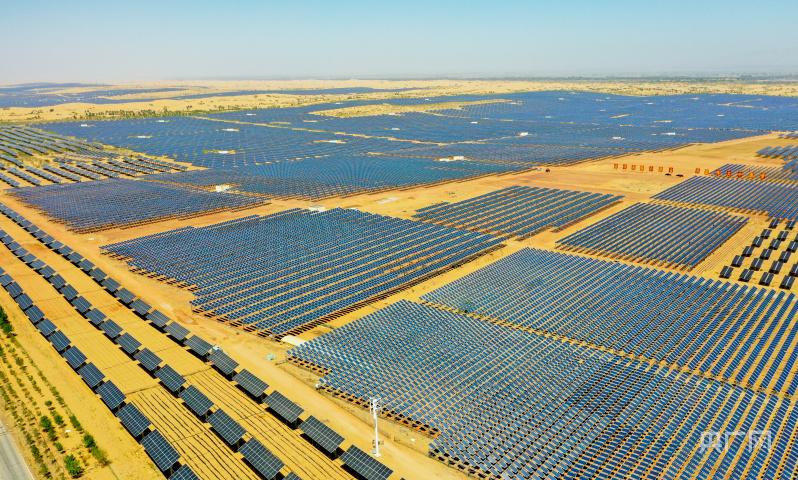 连片的太阳能光伏板不仅可以发电,还可以起到防风固沙的作用。