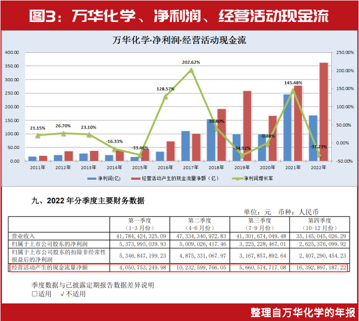 万华化学年报披露,2022年公司实现销售收入1655.65亿元,同比增加13.76%;实现归属于上市公司股东的净利润162.34亿元,同比减少34.14%;每股收益5.17元。2022年末,公司资产总额2008.43亿元,同比增长5.53%;归属母公司所有者权益768.45亿元,同比增长12.18%;公司加权平均净资产收益率22.75%,同比下降19.78%;每股净资产24.47元,同比增长12.14%;资产负债率59.50%,同比下降2.83%。通过财报可以发现,公司利润下降,主要是全球主要经济体经济增速下滑,需求下降,而上游能源价格却出现持续上涨,是整个行业特征。不过万华化学的经营活动现金流净额大幅高于净利润,经营活动现金流充沛,且2022年4个季度经营活动产生的现金流净额流入。另外,万华化学高固定资产投入,“短债长投”现象这些年一直存在,短期债务压力值得关注。