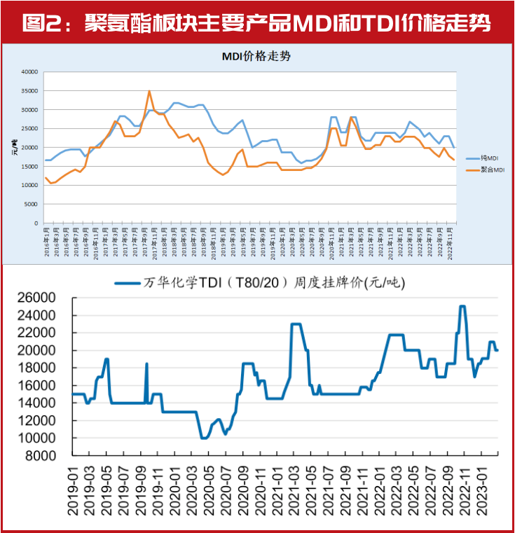 聚氨酯板块利润率下滑主要是成本端价格上涨,而价格端下降。聚氨酯板块的产品主要包括MDI、TDI、硬泡聚醚和软泡聚醚等,2022年MDI、TDI业务携手行业龙头企业实现长期战略合作,核心客户数量稳定上升,在海外已跻身全球主流供应商行列。聚醚业务年销量首次突破百万吨,改性产品紧扣客户需求,实现多个细分行业的市场份额第一。关于利润率的下降可以从产品的价格和原料端分析。
