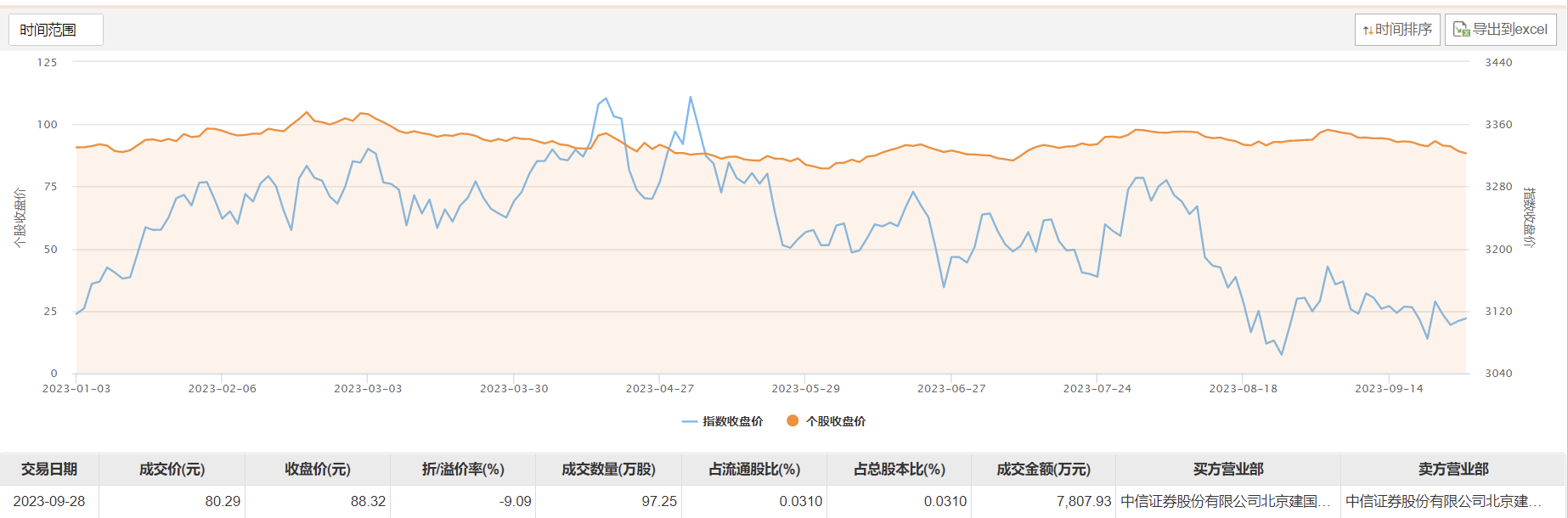 今日大宗交易成交97.25万股,成交额7807.93万元,占当日总成交额的7.36%,成交价80.29元,较市场收盘价折价9.09%。