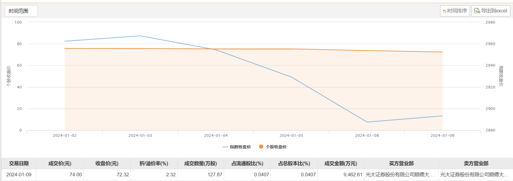 今日大宗交易成交127.87万股,成交额9462.61万元,占当日总成交额的11.15%,成交价74元,较市场收盘价溢价2.32%。