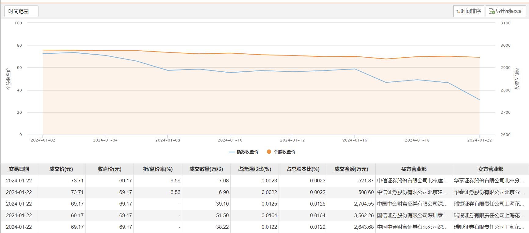 1月22日,万华化学今日大宗交易成交142.8万股,成交额9940.96万元,占当日总成交额的5.99%,成交均价69.61元,较市场收盘价溢价0.64%,其中最高成交价73.71元,最低成交价69.17元。