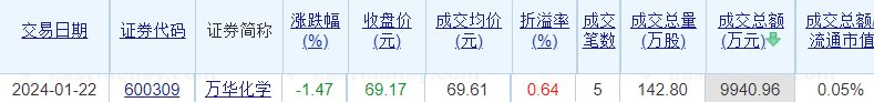 上证报中国证券网讯 据东方财富Choice数据,1月22日,万华化学大宗交易成交142.8万股,成交额9940.96万元,占当日总成交额的5.99%,成交均价69.61元,较市场收盘价溢价0.64%。