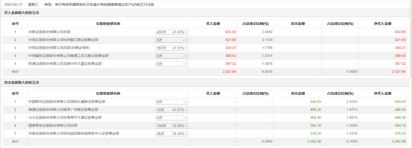 具体来看,华泰证券总部、中信证券杭州婺江路证券营业部分别买入604.69万元、521.65万元;中国银河证券洛阳太康路证券营业部、海通证券南京广州路证券营业部分别卖出544.03万元、488.20万元。