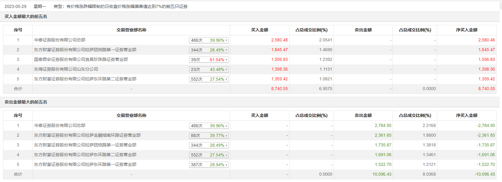 具体来看,华泰证券总部、东方财富证券拉萨团结路第一证券营业部分别买入2580.48万元、1845.47万元;华泰证券总部、东方财富证券拉萨金融城南环路证券营业部分别卖出2784.95万元、2361.85万元。