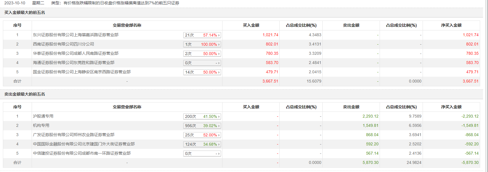 10月10日,宏达股份今日涨停,全天换手率达2.62%,振幅达9.56%。龙虎榜数据显示,营业部席位合计净卖出2202.8万元。其中,机构合计净卖出1549.81万元。此外,东兴证券上海肇嘉浜路证券营业部、西南证券四川分公司分别买入1021.74万元、802.01万元;沪股通专用、广发证券郑州农业路证券营业部分别卖出2293.12万元、868.04万元。