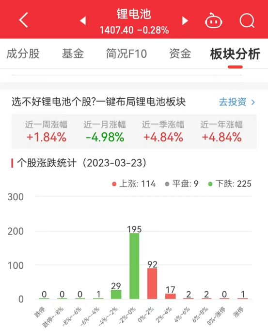 中国经济网北京3月23日讯今日,锂电池板块整体涨幅-0.28%,其中114只股票上涨,9只股票平盘,225只股票下跌。