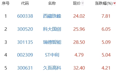 其中,西藏珠峰、科大国创、瑞德智能、ST中利、久吾高科位列板块涨幅前五位,涨幅分别为7.81%、6.05%、5.09%、5.04%、4.21%。