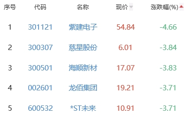 紫建电子、慈星股份、海顺新材、龙佰集团、*ST未来位列涨幅榜后五位,涨幅分别为-4.66%、-3.84%、-3.83%、-3.71%、-3.71%。