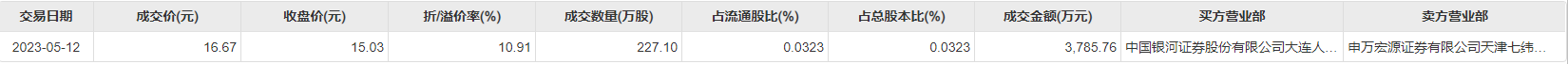 5月12日大宗交易成交227.1万股,成交额3785.76万元,占当日总成交额的17.82%,成交价16.67元,较市场收盘价15.03元溢价10.91%。