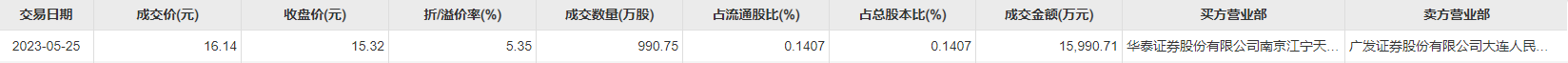 今日大宗交易成交990.75万股,成交额1.6亿元,占当日总成交额的56.58%,成交价16.14元,较市场收盘价溢价5.35%。