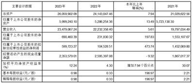 截至2023年末,公司总资产2,605.99亿元,同比增长7.94%,归属于上市公司股东的净资产599.92亿元,同比增加13.49%。