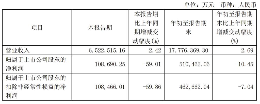 - 第三季度利润:10.87亿元人民币,同比下降59.01%;前三季度利润51.05亿元人民币,同比下降10.45%。