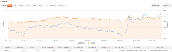 今日大宗交易成交969.84万股,成交额1.48亿元,占当日总成交额的29.72%,成交价15.31元,较市场收盘价溢价1.06%。