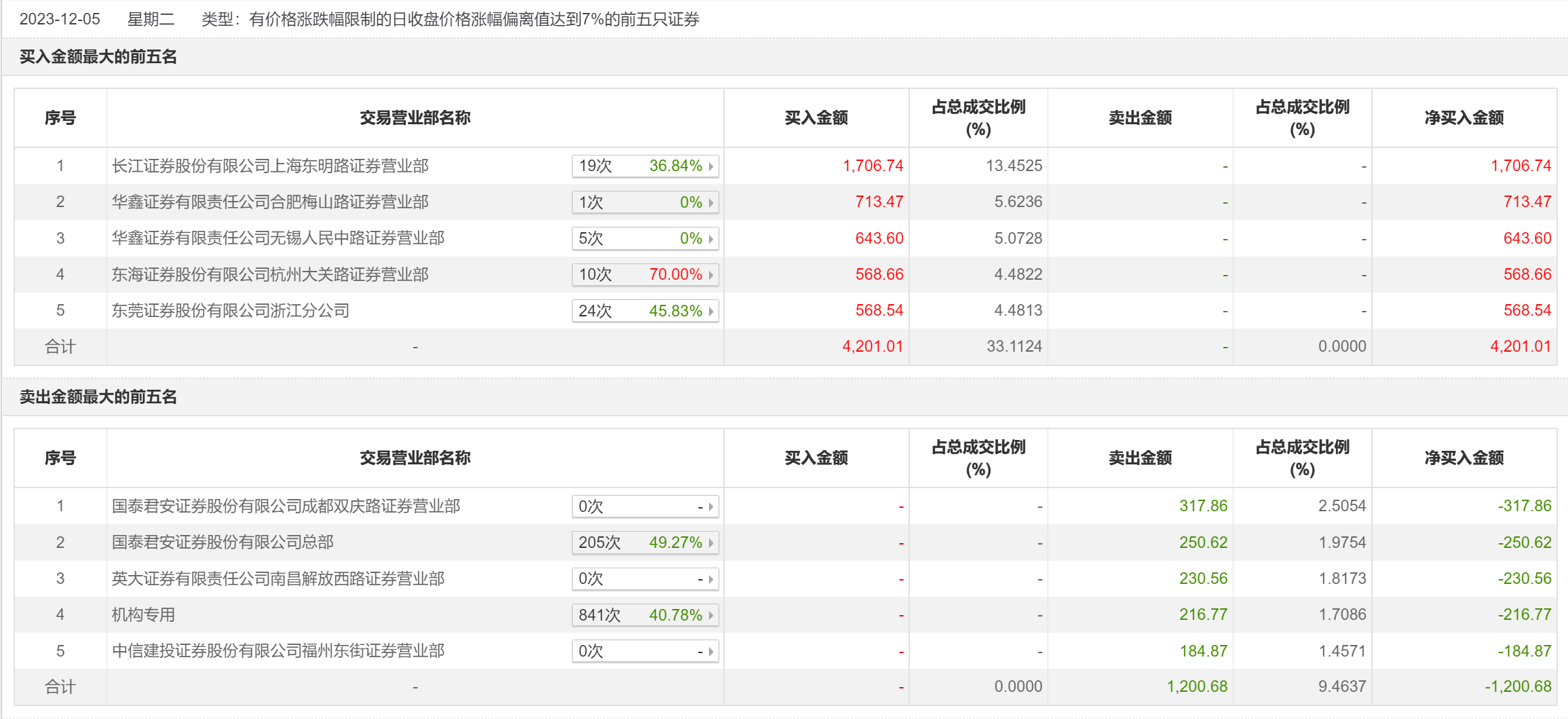 12月5日,国旅联合今日涨停,全天换手率达4.5%,振幅达10.83%。龙虎榜数据显示,营业部席位合计净买入3000.33万元。其中,机构合计净卖出216.77万元。此外,长江证券上海东明路证券营业部、华鑫证券合肥梅山路证券营业部分别买入1706.74万元、713.47万元;国泰君安证券成都双庆路证券营业部、国泰君安证券总部分别卖出317.86万元、250.62万元。