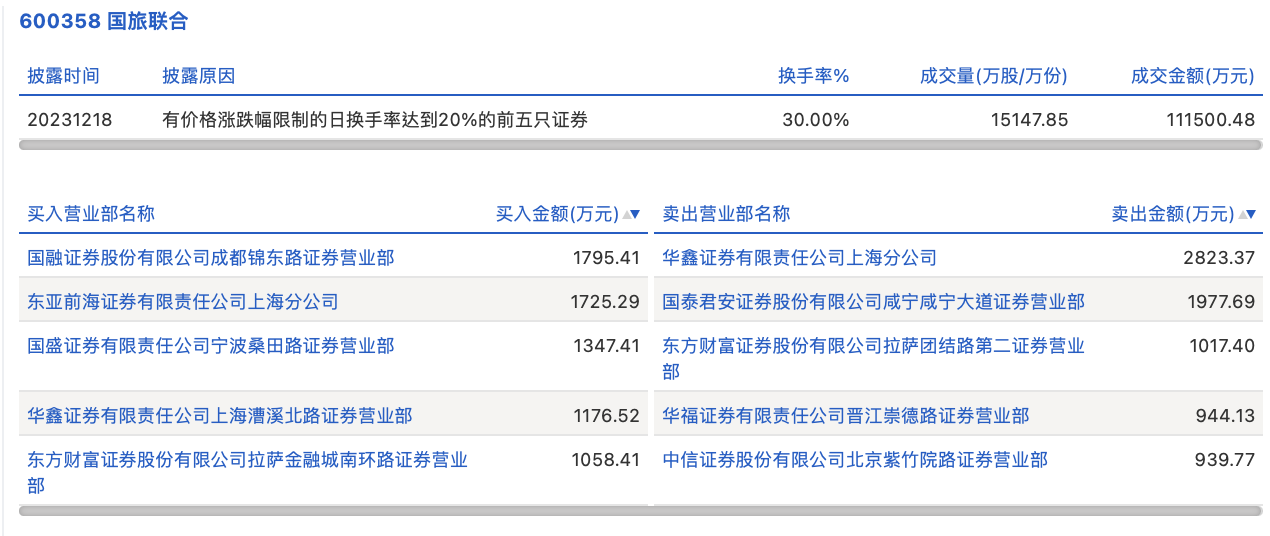 12月18日,国旅联合今日涨停,龙虎榜数据显示,上榜营业部席位全天成交1.48亿元,占当日总成交金额比例为13.28%。其中,买入金额为7103.03万元,卖出金额为7702.36万元,合计净卖出599.33万元。