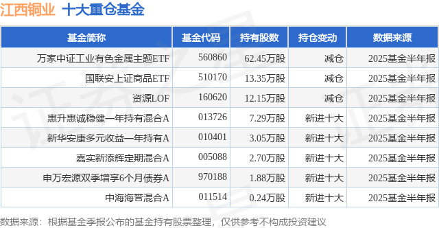 根据2025基金半年报公募基金重仓股数据,重仓该股的公募基金共8家,其中持有数量最多的公募基金为万家基金的万家中证工业有色金属主题ETF。万家中证工业有色金属主题ETF目前规模为4.31亿元,最新净值1.4669(10月13日),较上一交易日上涨3.19%,近一年上涨8.75%。该公募基金现任基金经理为贺方舟。贺方舟在任的基金产品包括:万家上证50ETF,管理时间为2024年4月15日至今,期间收益率为32.0%;万家180指数A,管理时间为2024年4月15日至今,期间收益率为35.57%;万家中证工业有色金属主题ETF发起式联接A,管理时间为2024年11月2日至今,期间收益率为61.64%;