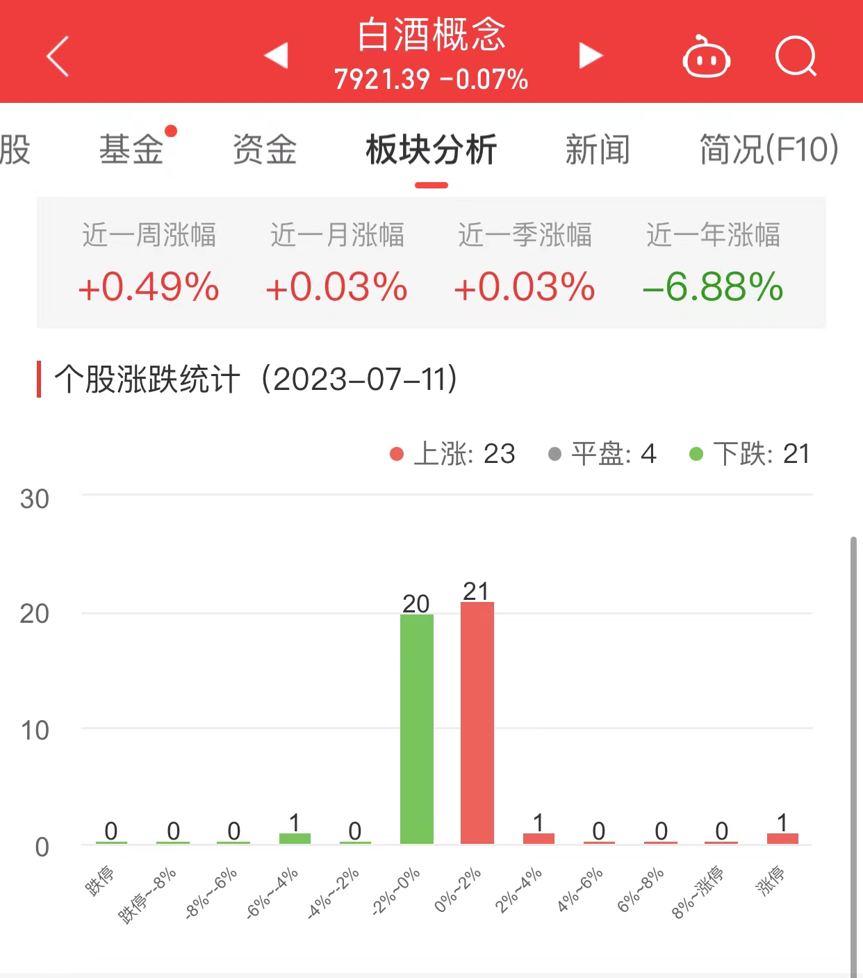 数据显示,截至今日,白酒概念板块近一周涨幅0.49%,近一月涨幅0.03%,近一季涨幅0.03%。