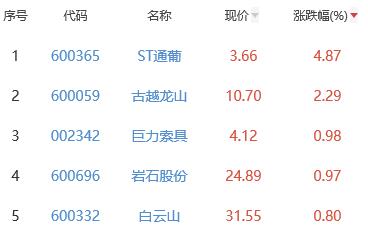 其中,ST通葡、古越龙山、巨力索具、岩石股份、白云山位列板块涨幅前五位,涨幅分别为4.87%、2.29%、0.98%、0.97%、0.80%。