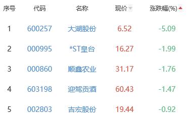 大湖股份、*ST皇台、顺鑫农业、迎驾贡酒、吉宏股份位列涨幅榜后五位,涨幅分别为-5.09%、-1.99%、-1.76%、-1.47%、-0.92%。