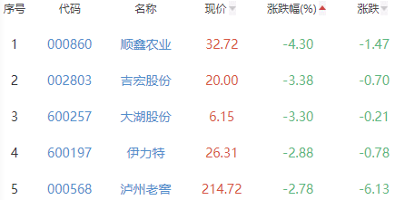 顺鑫农业、吉宏股份、大湖股份、伊力特和泸州老窖位列涨幅榜后五位,涨幅分别为-4.30%、-3.38%、-3.30%、-2.88%和-2.78%。