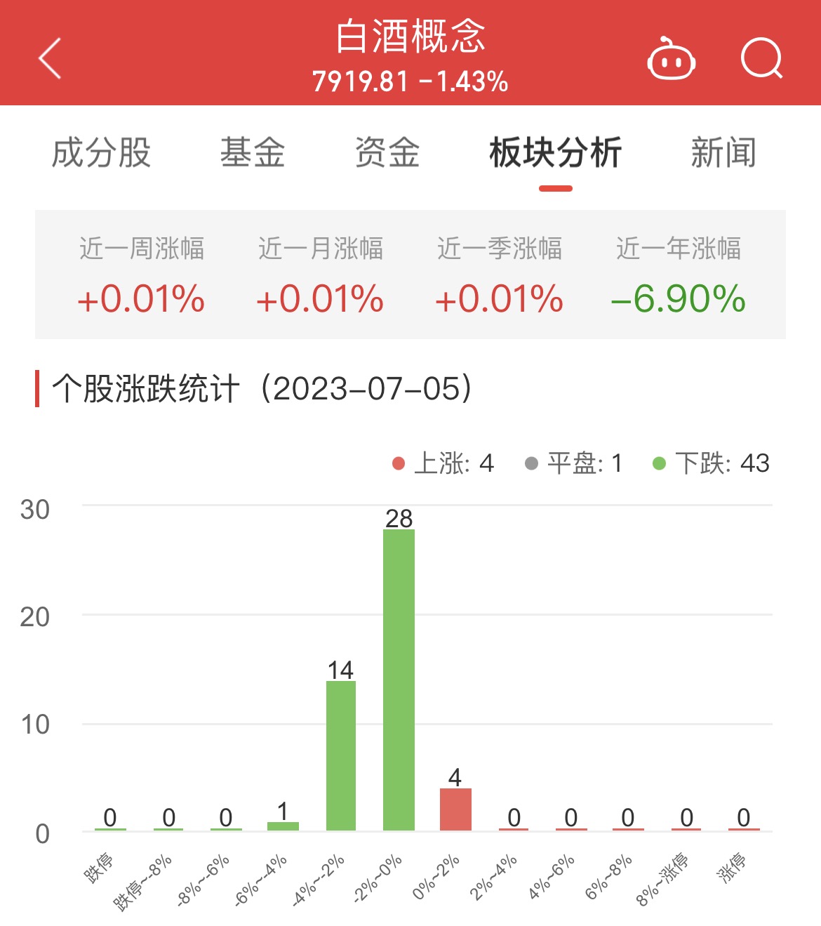 中国经济网北京7月5日讯今日,白酒概念板块整体涨幅-1.43%,其中4只股票上涨,1只股票平盘,43只股票下跌。
