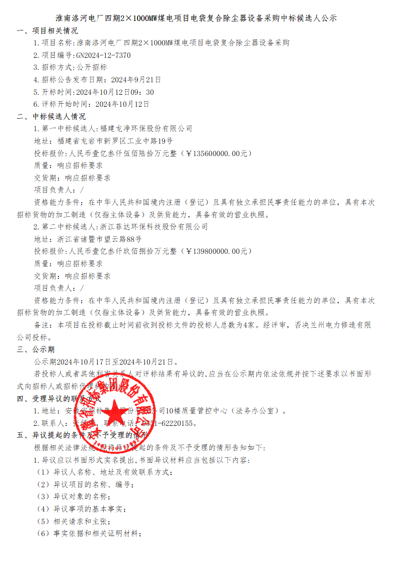 中国招标投标公共服务平台发布淮南洛河电厂四期2×1000MW煤电项目电袋复合除尘器设备采购中标候选人公示,福建