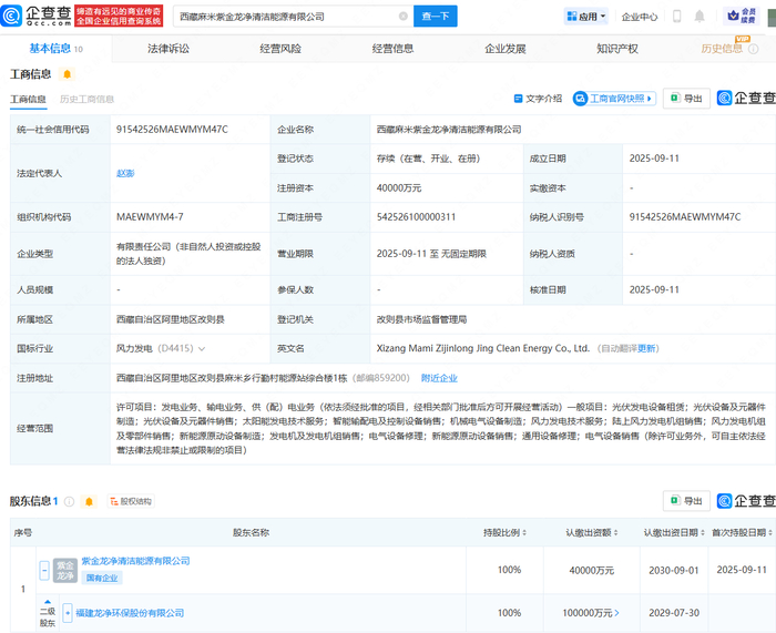 企查查APP显示,近日,西藏麻米紫金龙净清洁能源有限公司成立,法定代表人为赵澎,注册资本为4亿元,经营范围包含:发电业务、输电业务、供(配)电业务;光伏设备及元器件制造;风力发电技术服务;陆上风力发电机组销售等。企查查股权穿透显示,该公司由龙净环保(600388)间接全资持股。