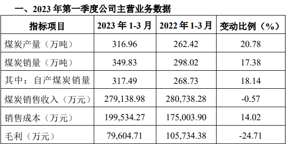 4月14日公告,公司一季度煤炭销售收入27.91亿元,同比下滑0.57%。