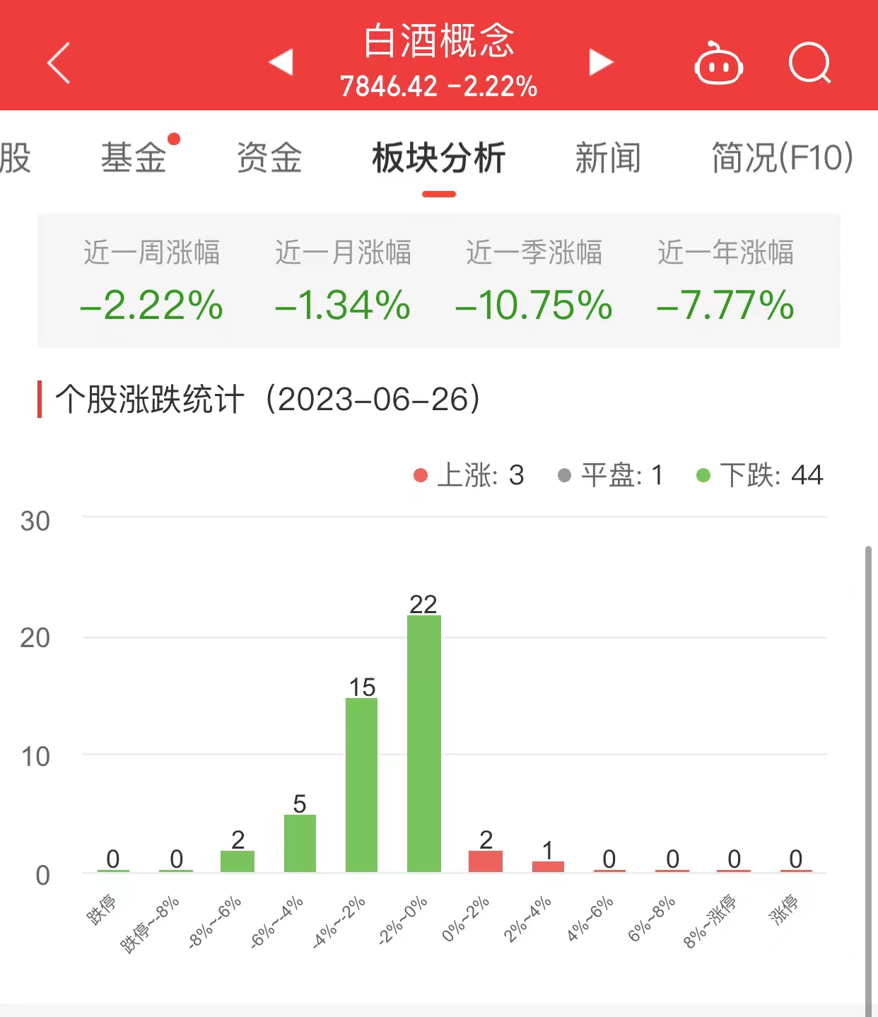中国经济网北京6月26日讯今日,白酒概念板块整体跌幅2.22%,其中3只股票上涨,1只股票平盘,44只股票下跌。
