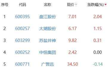 其中,盘江股份、大湖股份、苏盐井神、中恒集团、广誉远位列板块涨幅前五位,涨幅分别为2.04%、1.15%、0.31%、0.00%、-0.14%。